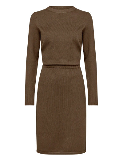 Denna stickade klänning har en klassisk rund halsringning och långa ärmar, vilket ger en bekväm och stilren passform. Den subtila midjedetaljen framhäver silhuetten, vilket gör den till ett mångsidigt val för olika tillfällen.