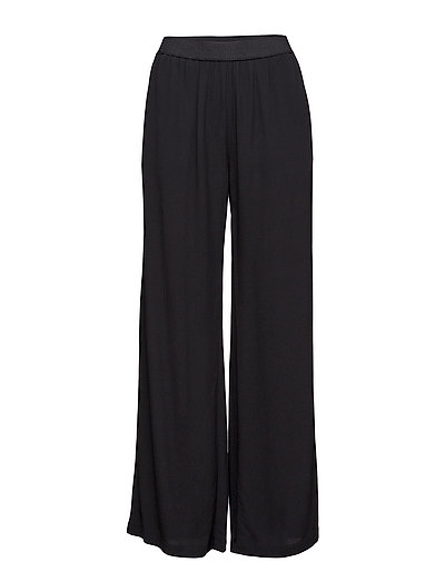 These wide leg trousers have been cut from a draping crepe viscose fabric. Volume gathers into the decorative elasticated waistband for an easy, fuss free trouser. Inside leg lenght is 77.5cm on size small.