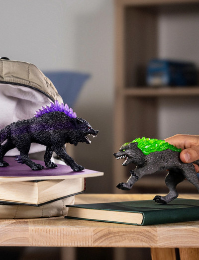 Med den praktiska blisterförpackningen kan striden börja direkt. Här gömmer sig nämligen två angreppslystna invånare från ELDRADOR®. De kommer från olika världar – skuggvärlden och stenvärlden. Men en sak har de gemensamt: dåligt humör och vassa tänder som de gillar att använda. Den här gången kastar sig skuggvargen och granitvargen in i striden!