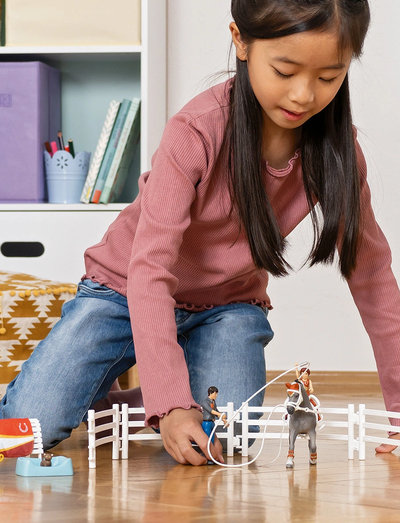 Den lilla flickan Mia kan förbereda sig perfekt för sin första tävling med hjälp av voltige-setet från schleich® HORSE CLUB. Den manlige ridinstruktören Tom håller tävlingshästen i voltige-selen och svingar försiktigt med piskan i sin hand så att hästen springer jämnt i en cirkel inom staketdelarna, som kan kopplas in efter önskemål. Hannahs syster Mia har rörliga armar som hon kan hålla i och ta emot den stora gyllene trofén med. Sadel, träns och täcke kan tas av och förvaras på den övre förvaringshyllan efter träningen. Den bruna kattungen följer händelserna med intresse medan hon kryper ner i sin mysiga lilla korg.