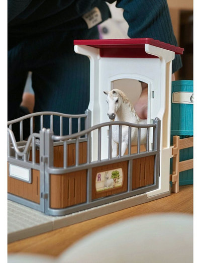 Efter all ridning, hoppning och städning ser alla hästar fram emot en paus. Det bästa sättet att göra det på är i det mysiga häststallet från schleich® HORSE CLUB. Här finns allt som ett hästhjärta kan önska sig: de kan äta vid foderbordet och vattentråget släcker även den största hästens törst. Det enda som saknas är en glassmaskin. Som tur är kan du stänga boxen eller låta den stå öppen, beroende på humör. Hästarna föredrar att det är öppet så att de kan visa upp sina mästerskapsrosetter. Men det är bara de riktigt fina priserna som visas upp. Annars skulle det inte finnas någon plats kvar för hästarna! Vilket rum känner du dig mest hemma i?