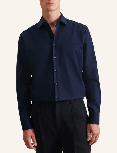 Denna businesskjorta i regular fit är tillverkad i poplin och har en Kent-krage. Den är designad för att vara lättstruken. Väven ger en slät textur, vilket gör den till ett mångsidigt val för professionell användning.