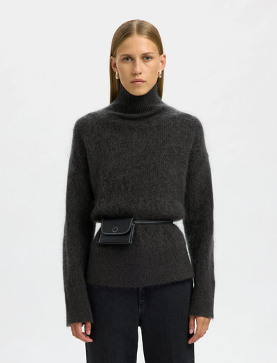 Denna stickade tröja har en mysig känsla och en hög hals för extra värme. De nedhasade axlarna skapar en avslappnad silhuett, medan de ribbade muddarna ger en touch av elegans till denna modell med normal passform.