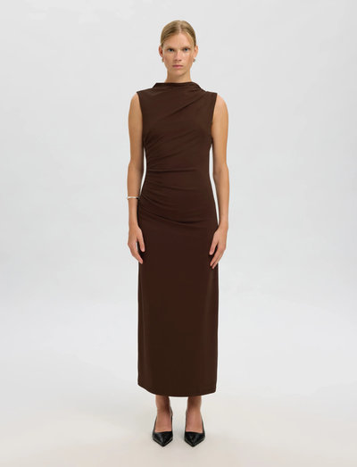 Denna ärmlösa maxiklänning är skapad för en elegant silhuett och har en sofistikerad polokrage. De rynkade detaljerna tillför en touch av textur och visuellt intresse, vilket gör den till en utmärkt klänning för kvällsevenemang.