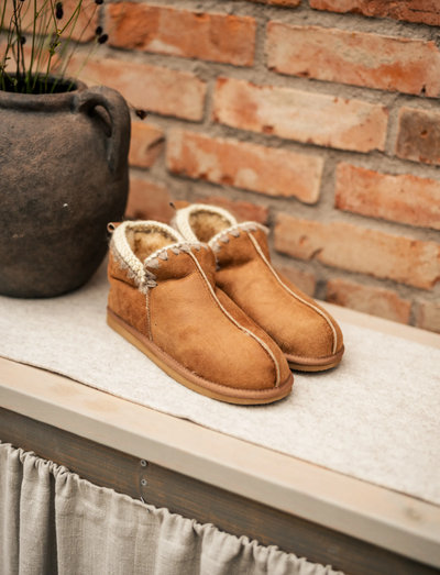 Dessa snygga tofflor är gjorda av mjukt fårskinn och har en bekväm passform. De har en dekorativ virkad kant och en slitstark yttersula. Perfekt för att hålla fötterna varma och mysiga under de kallare månaderna.