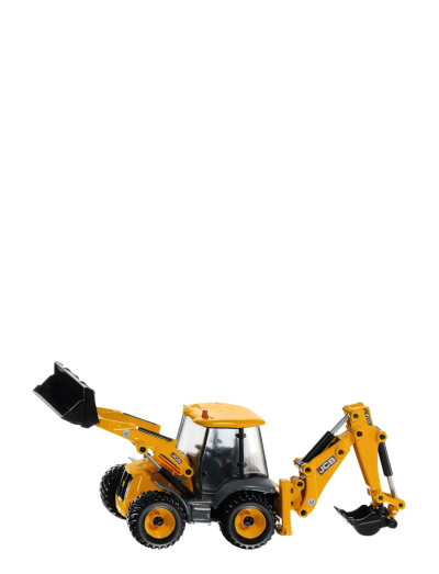 JCB 4CX grävlastare är både en hjullastare och en grävmaskin. Allroundmaskinen kan användas för att gräva diken på byggarbetsplatsen, men även för att lasta jord, grus, sand och bråte. I den funktionella leksaken i skala 1:50 är frontlastaren och grävmaskinen rörliga.