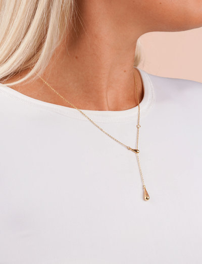 Detta eleganta halsband kombinerar rena linjer, rörelse och en touch av glitter. Den smala kedjan avslutas med ett droppformat hänge, vilket skapar en känsla av flytande rörelse.