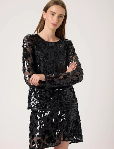 Glittrande paljetter lyfter denna långärmade topp, perfekt för kvällsevenemang. Det skira tyget ger en touch av lockelse, medan den klassiska silhuetten säkerställer en smickrande passform. Kombinera den med skräddarsydda byxor eller en kjol för en elegant look.