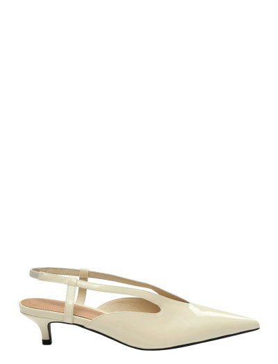 Dessa slingbacks är tillverkade i glänsande lackläder och har eleganta utskärningar på sidorna och en smickrande V-skärning vid vristen. Designen fulländas med en låg kitten-klack och en spetsig tå, medan slingback-remmen är elastisk för en säker passform.