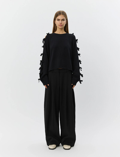 Iögonfallande rosetter pryder ärmarna på denna stickade tröja. Denna tröja är ett bekvämt val för kyligare dagar och ger en avslappnad passform och en lekfull charm.