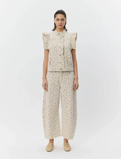 Dessa jeans har en beskuren längd och en avslappnad barrel-form, vilket ger en modern silhuett. Det allover-blommönstret tillför en touch av lekfullhet, vilket gör dem till ett utmärkande plagg för både avslappnade och mer uppklädda stilar.