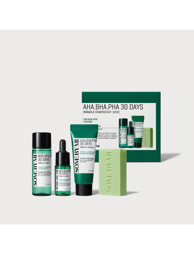 Ett startkit som innehåller en komplett hudvårdsrutin för dig med oren och/eller fet hud. Detta populära kit från märket Some By Mi är känt för att minska fläckar, akne och ojämn hudton på endast 30 dagar. Med seriens innehåll av bl.a. 20 olika växtextrakt, tea tree och salicylsyra tar produkterna bort döda hudcellerna, djuprengör porerna och förhindrar orenheter samt pormaskar. Du behöver inte oroa dig för en uttorkad hud, då hela serien är mild och återfuktande. Du kommer också att kunna se en minskning av hudirritation och rodnad. Kitet är enkelt att använda och innehåller rengöring, toner, serum och kräm i stora provstorlekar, så att du kan testa produkterna innan du köper dem i en större storlek. Produkterna kan användas både morgon och kväll.Kitet innehåller: AHA BHA PHA 30 Days Cleansing Bar 30 g. AHA BHA PHA 30 Days Miracle Toner 30 ml. AHA BHA PHA 30 Days Miracle Serum 10 ml. AHA BHA PHA 30 Days Miracle Cream 20 g.