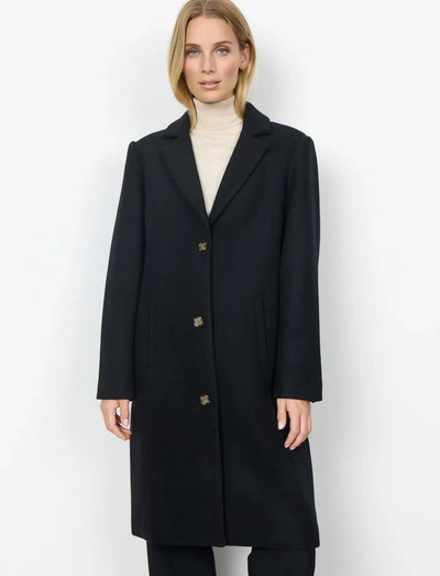 SC-ASTA 2 is a long fashionable coat in a polyester and wool mix. It has three big buttons and a reverse collar. You can style this elegant coat with a warm scarf and big boots for the cold weather.