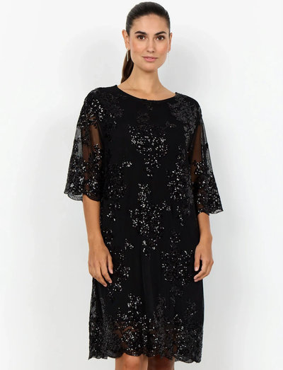 Elegant och iögonfallande klänning med skimrande paljetter över ett skir lager tyg. Designen fulländas av en klassisk rund halsringning och halvlånga ärmar, vilket gör den till ett sofistikerat val för kvällsevenemang.