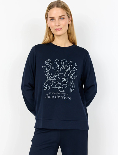 Denna sweatshirt har ett blommigt tryck med text framtill och erbjuder både komfort och stil. Den runda halsen och muddarna bidrar till den klassiska designen. Tillverkad av en blandning av modal, polyester och elastan, vilket ger en mjuk och flexibel passform, perfekt att kombinera med jeans eller lediga byxor.