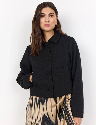 Denna jacka är tillverkad av en blandning av återvunnen polyester, bomull, ull och viskos, och har en mjuk krage och en texturerad finish. Stora, tygklädda knappar ger en elegant touch, medan två framfickor ger praktisk användbarhet. Styla detta plagg med skräddarsydda byxor eller en figursydd kjol för en sofistikerad ensemble.