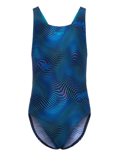 Denna baddräkt är designad för komfort och prestanda och är idealisk för unga simmare. Leaderback-stilen ger full rörelsefrihet i vattnet. Ett livfullt, vågigt mönster ger en snygg touch.