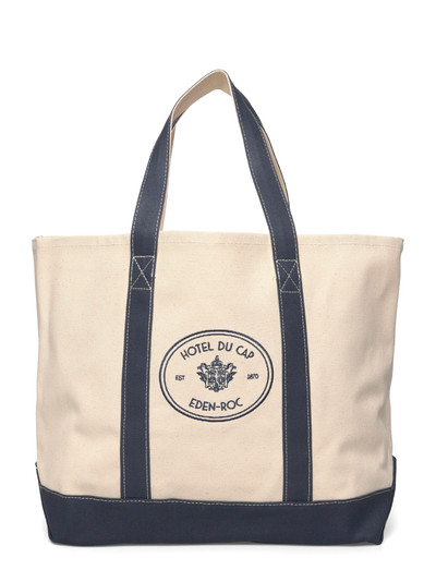 Denna tote bag har robusta bärhandtag och ett rymligt inre, vilket ger både praktisk användbarhet och stil. Designen har en tvåfärgad effekt med en kontrasterande bas och ett emblem på framsidan.