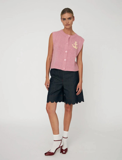 Denna stickade väst har en klassisk rund hals och knäppning, vilket gör den till ett mångsidigt lager-på-lager-alternativ. Den ärmlösa designen och ribbade kanten bidrar till dess charm, medan ankerdetaljen ger en nautisk touch.