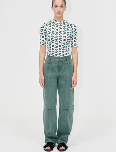 Dessa denimbyxor har en hög midja och en smickrande rak benmodell, vilket ger en tidlös silhuett. De är försedda med praktiska fram- och bakfickor och en dragkedjegylf samt iögonfallande kontrastsömmar.