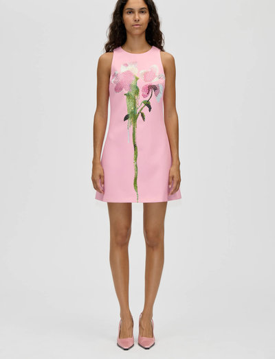 Denna miniklänning är tillverkad i kraftig, bonded crepe och har en distinkt strumpebandsdesign. Den ärmlösa konstruktionen och den korta längden gör den idealisk för varmare väder, medan blomsterdekorationerna tillför ett visuellt intressant element.