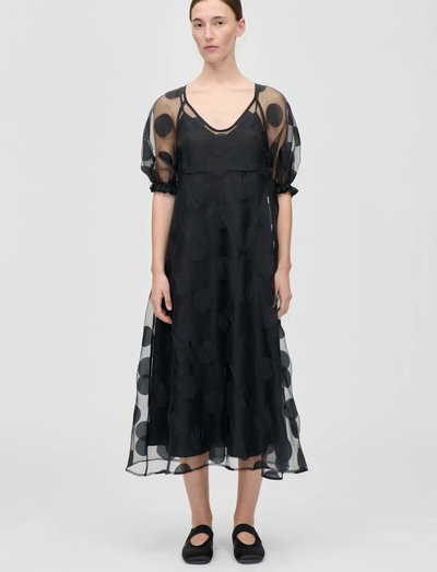 Denna midiklänning är tillverkad i ett skir tyg och har ett lekfullt prickigt mönster. Designen har korta puffärmar och en A-linje silhuett, och den levereras med en underklänning för att säkerställa bekväm täckning.