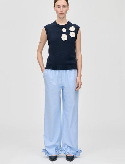 Lyft din stickade kollektion med denna charmiga väst, med delikata virkade blomsterapplikationer framtill. Den avslappnade passformen och ribbade kanterna säkerställer ett bekvämt och stilfullt tillskott till vilken outfit som helst.
