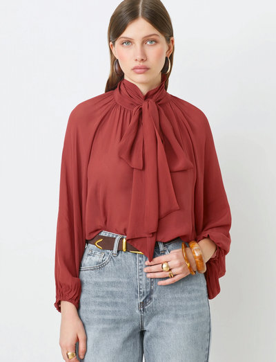En flytande silhuett definierar denna långärmade blus, som avslutas med en knytdetalj i halsen. Det lätta materialet och den avslappnade passformen gör den idealisk för lager-på-lager eller att bära som den är.