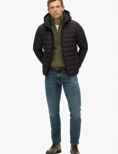 Med sin eleganta, minimalistiska design är denna vadderade jacka ett mångsidigt tillskott till varje garderob. Den har en smal passform, justerbar huva och fåll samt elastiska muddar för en åtsittande känsla. Flera fickor ger praktisk förvaring, medan det lätta materialet säkerställer värme och rörelsefrihet, vilket gör den idealisk för lager-på-lager-styling.
