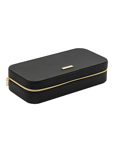 The perfect jewelry case for keeping all your jewelry organized in one place. Made of black vegan leather, with a beige micro fibre inside. Zipper and logo tag in gold finish.