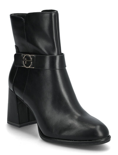 En elegant profil definierar dessa ankelstövlar, kompletterad med en blockklack för stabil höjd. Designen har en dekorativ rem med metallisk detalj, vilket ger en touch av subtil glans.