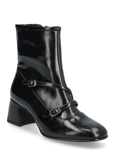 Dessa stövlar har en blockklack och dekorativa remmar med spänndetaljer, vilket ger en stilfull och säker passform. Den eleganta designen gör dem till ett mångsidigt tillskott till varje garderob.