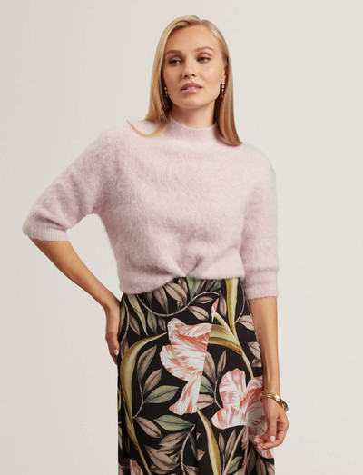 Denna stickade tröja har en raffinerad silhuett med trekvartsärmar och en hög halsringning. Den mjuka texturen tillför ett lager av komfort och sofistikering till varje ensemble.