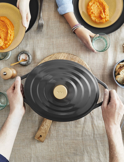 Med Tefal Air gryta får du alla fördelar med en gjutjärnsgryta, men i en lätt och modern design. Grytan är tillverkad av gjuten aluminium som är tre gånger lättare än klassiska gjutjärnsgrytor. Tefal Air är den perfekta grytan för att tillaga mustiga grytor, söndagssstek, pulled pork eller soppor. Grytan är dessutom mycket enkel att rengöra tack vare den keramiska beläggningen samt att den går att diska i diskmaskinen. Tefal Air har ett medföljande kondenslock designat med små toppar som främjar vattencirkulationen och gör dina grytor möra och saftiga. Kompatibel med alla spishällar - gas, el, keramik och induktion. Grytan är även ugnssäker, perfekt för pulled pork eller söndagsstek. Trots sin lätta design är konstruktionen i tjock, robust gjuten aluminium som håller för användning dag efter dag.