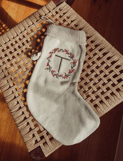 The color and beautiful design with the embroidered wreath makes it a part of the christmas decorations. And to personalize it, you can get you childs initial on it.