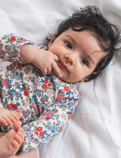 Den här bodystockingen är ett snyggt och bekvämt val för din lilla. Den har ett vackert blommönster och långa ärmar, vilket gör den perfekt för vardagsbruk.