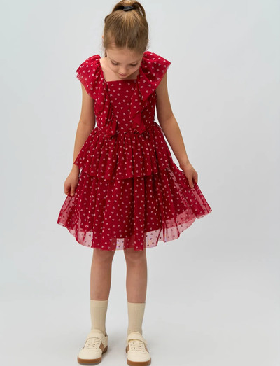 A sweet and romantic dress from THE NEW that exudes elegance and playfulness. The dress features delicate ruffle details at the shoulders and skirt, creating a beautiful, voluminous look. The lightweight mesh fabric is decorated with small hearts. The dress is designed with two layers: a soft and breathable cotton lining on the inside and a sheer, lightweight mesh layer on the outside. It has a practical side zipper for easy dressing, while the elastic waistband ensures a comfortable and flexible fit. Perfect for special occasions that call for a little extra charm. - Short dress with a length that falls just above the knees - Regular fit with an A-line cut and an elastic waistband that accentuates the waist - Sleeveless - Ruffle trim along the straps - Cute heart print - Side zipper for easy dressing