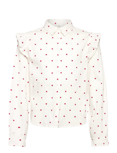 Denne skjorte fra THE NEW er designet i en regular fit og giver et klassisk, afslappet look. Den har lange ærmer og et sødt hjerte AOP (all-over print), der tilføjer et legende touch til din garderobe. Skjorten har en flipkrave, der giver den et stilfuldt twist, og de fine flæser på skuldrene skaber en feminin detalje, der skiller sig ud. Perfekt til både hverdag og festlige anledninger, hvor du ønsker at udstråle både komfort og charme.- Regular fit.- Long sleeves.- Heart AOP. - Flip collar.- Frills on shoulders.