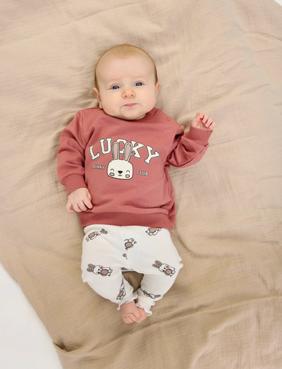 Long-sleeved sweatshirt with a cute bunny print on the chest. Around the bunny's head is the text "Lucky - Bunny Club." This lovely sweatshirt from THE NEW Siblings is perfect for everyday wear and easy to style with a nice pair of leggings.