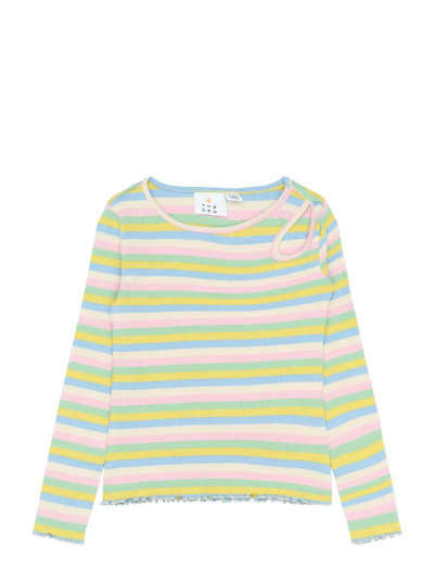 This long-sleeve rib tee for girls from THE NEW is made from 95% cotton and 5% elastane for gentle stretch. It features a round neckline and an asymmetric shoulder cut-out with a slim strap detail. The ribbed fabric shows multicolour pastel stripes, and the hem and cuffs are finished with a lettuce edge. The silhouette works well for layering under cardigans or jackets and is easy to style with jeans, skirts, or shorts.- Long sleeves with round neckline- Ribbed stretch fabric with lettuce-edge hem and cuffs- Asymmetric shoulder cut-out with strap detail- Contains 95% Cotton Organic GOTS, 5% Elastane. Luxkids is GOTS certified by Control Union, 842535. Only the products which carry the GOTS label and claim are certified.
