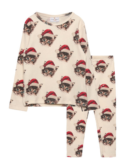 This pajama set from THE NEW Siblings is both cozy and festive perfect for bedtime during the holiday season. It includes a long-sleeved top and matching pants with a fun all-over print, available in two versions: cats wearing Santa hats or dinosaurs in Christmas outfits. The soft and stretchy ribbed fabric ensures great comfort and freedom of movement all night long.- Set with top and pants - Festive all-over prints: Christmas cat or holiday dinosaur - Soft and stretchy ribbed quality - Snug fit - Perfect for cozy holiday nights and morning cuddles- GOTS Organic, certified by Control Union, 842535.