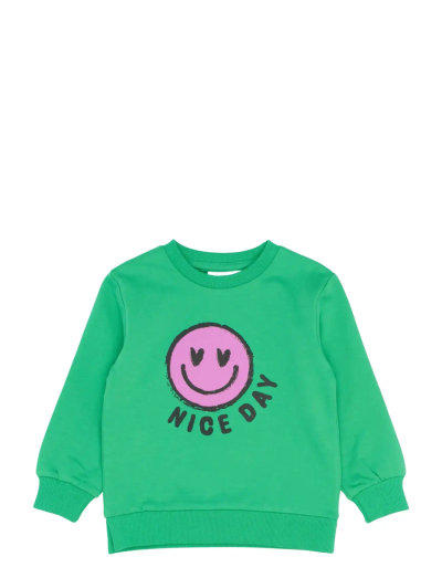 This green sweatshirt is the perfect choice for a relaxed yet eye-catching style. The wide sleeves and ribbed details at the hem, sleeves, and collar provide a comfortable and modern fit, while the large front print of a pink smiley with heart eyes and the text "NICE DAY" adds an optimistic and playful touch. Perfect for spreading positive energy and brightening up your day!