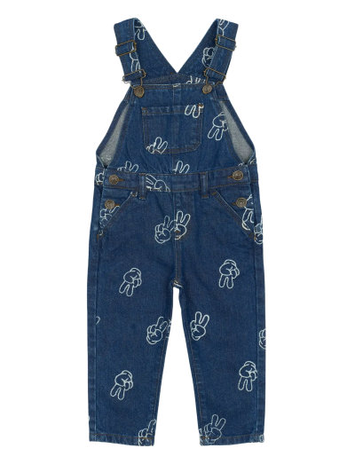 These denim overalls combine a classic design with a playful twist. The overalls feature a unique all-over print of small hands making peace signs, adding a fun and creative touch. The adjustable shoulder straps ensure a flexible fit, while the front and side pockets make them both practical and stylish. Perfect for active days and playtime!