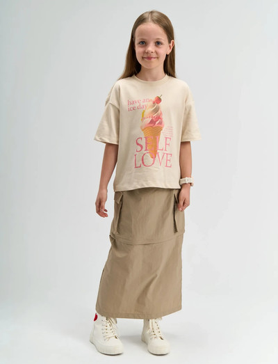 This girls short-sleeve tee from THE NEW is made from 100% organic cotton for everyday wear. It features a classic crew neckline, slightly dropped shoulders, and a straight hem. The front displays an ice-cream cone graphic with SELF LOVE and have an ice day text in pink tones. The relaxed look pairs easily with shorts, jeans, or skirts and works well for layering under a cardigan or jacket. A simple choice for casual days and warm seasons.- 100% organic cotton fabric- Crew neckline with short sleeves and dropped shoulders- Front graphic with ice-cream cone and positive textGOTS Organic, certified by Control Union, 842535.