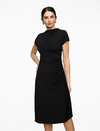 Den här midiklänningen har en bekväm passform. Den har korta ärmar och en rund halsringning. Klänningen är gjord av ett mjukt och stretchigt material. Den är perfekt för alla tillfällen.