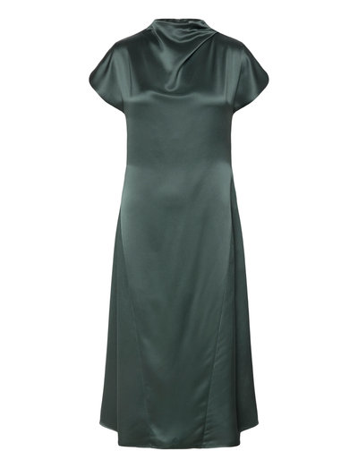 Denna klänning är tillverkad av en tung satin som faller vackert till mitten av vaden. Den har korta ärmar och en mjukt draperad, medelhög halsringning som balanserar moderna detaljer med klassisk elegans. Triangelinsatser i sidsömmarna skapar en subtil utsvängning som framhäver den flytande silhuetten. Naia acetat satinblandningen ger en lyxig känsla.