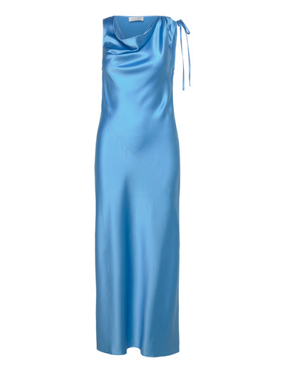 Denna klänning är tillverkad med en draperad halsringning och ger en sofistikerad silhuett. Den ärmlösa designen och midilängden gör den till ett mångsidigt val för olika tillfällen, medan knytdetaljen vid axeln ger en touch av elegans.