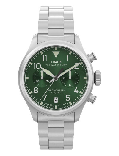 Denna kronograf är en nytolkning av den traditionella pilotklockan, med en borstad boett i återvunnet rostfritt stål. Den rena urtavlan med hög kontrast säkerställer snabb avläsning med tydliga arabiska siffror. Ett datumfönster sitter klockan 6 och självlysande visare bidrar till funktionaliteten. Den levereras med ett borstat armband i återvunnet rostfritt stål med snabbfästen och självjusterande länkar.