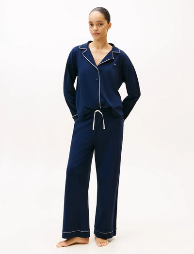Njut av en vilsam natt i detta bekväma pyjamasset. Den långärmade överdelen har en knäppning fram och klassisk passpoalkant, medan de matchande byxorna erbjuder en avslappnad passform för ultimat komfort.