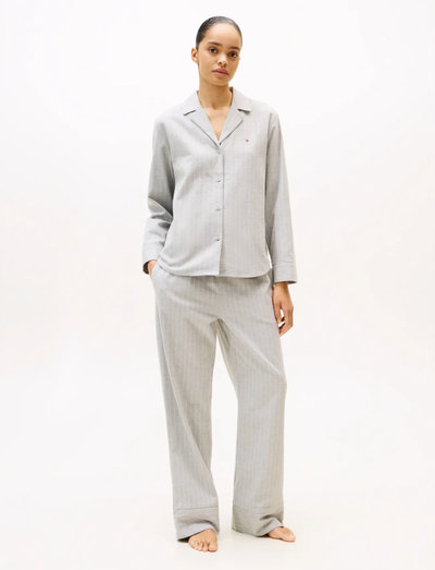 Njut av en vilsam natt i detta bekväma pyjamasset. Den långärmade skjortan har en knäppning fram och en klassisk krage, medan de matchande byxorna har en elastisk midja för en flexibel passform. Perfekt för att slappa eller sova i.